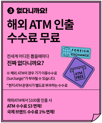 전세계 어디든 뽑을때마다 ATM 인출 수수료가 없습니다. 해외 ATM에서 $100를 인출 시 ATM 수수료 $3를 면제해주고, 국제 브랜드 수수료 1%를 면제해줍니다.