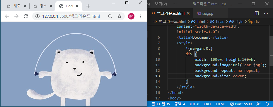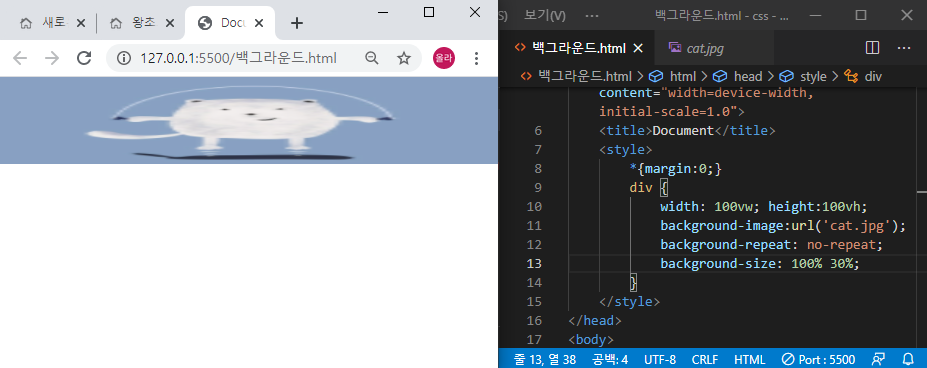 - 속성값으로 백분율을 넣어주면, 배경 이미지가 들어갈 요소의 크기를 기준으로 백분율 값을 지정하고, 그 크기에 맞도록 배경 이미지를 확대하거나 축소해줍니다.