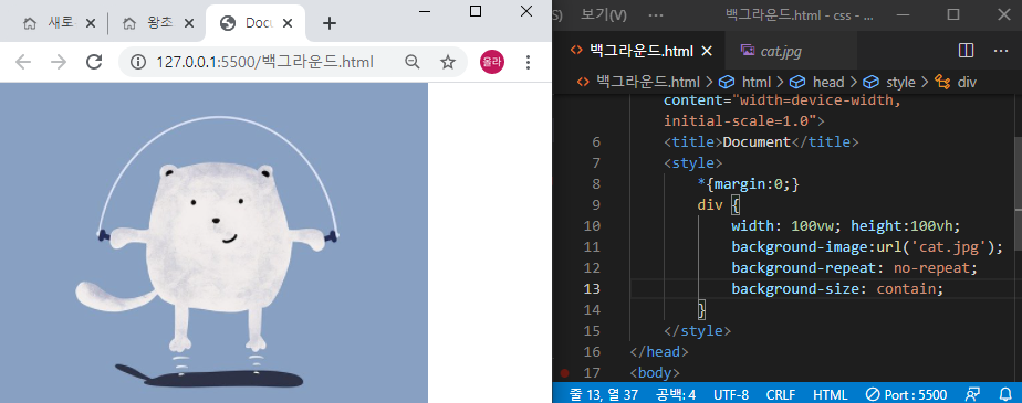 - contain은 배경 이미지가 다 들어오도록 하는 것이 목적이기 때문에, 위 예시에서 이미지의 가로세로 비율에 따라 오른쪽이 하얀색으로 비어있게 됩니다.